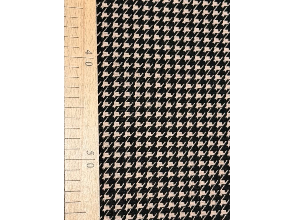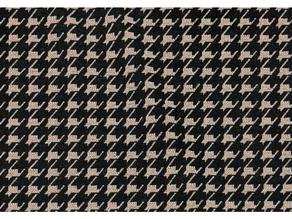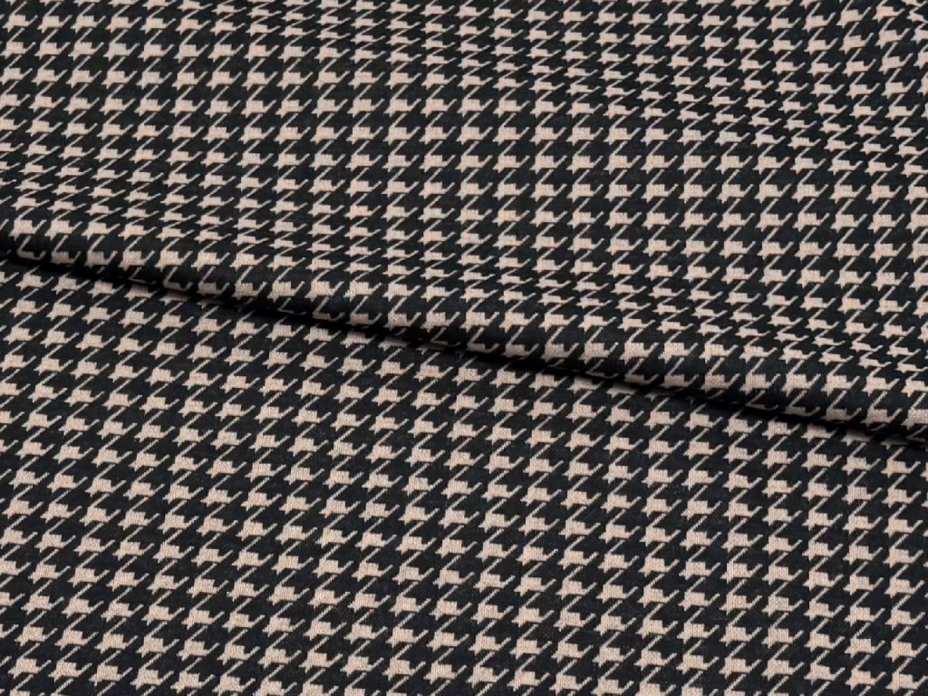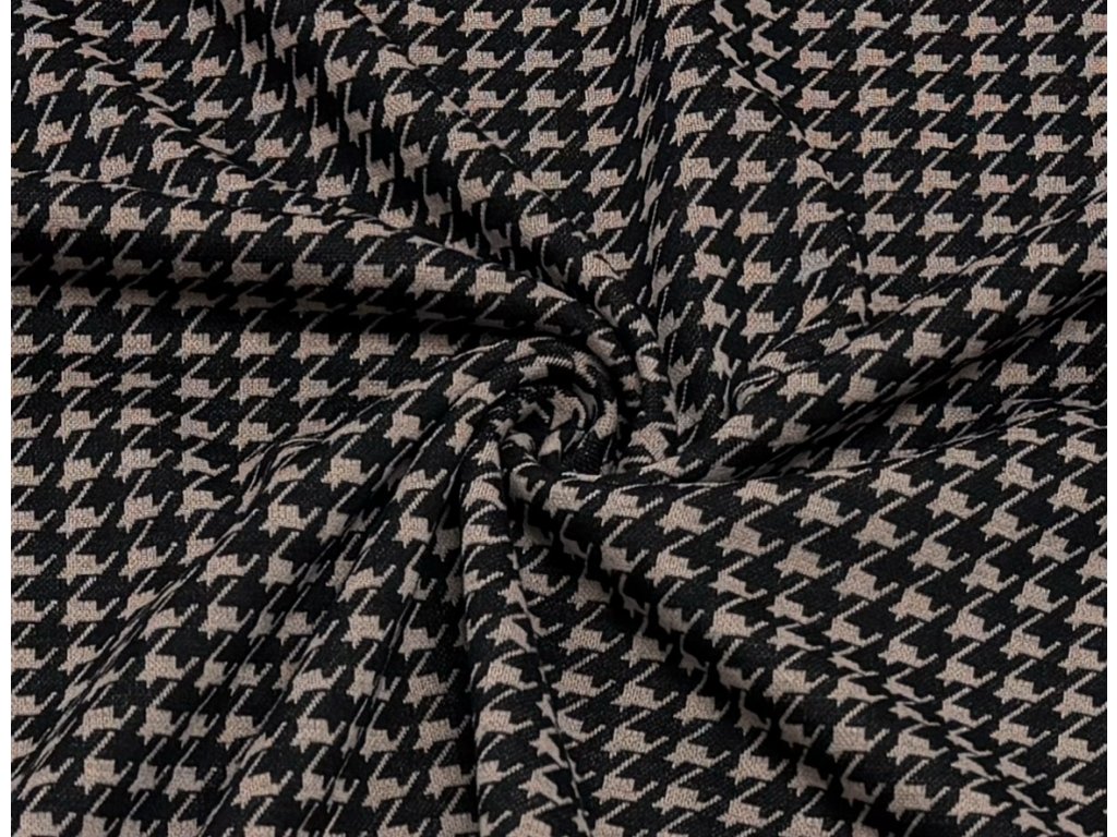 Žakár s kohoutí stopou je elegantní a nadčasová látka s vetkaným vzorem, který není potištěný, ale tvoří přirozenou součást struktury materiálu.